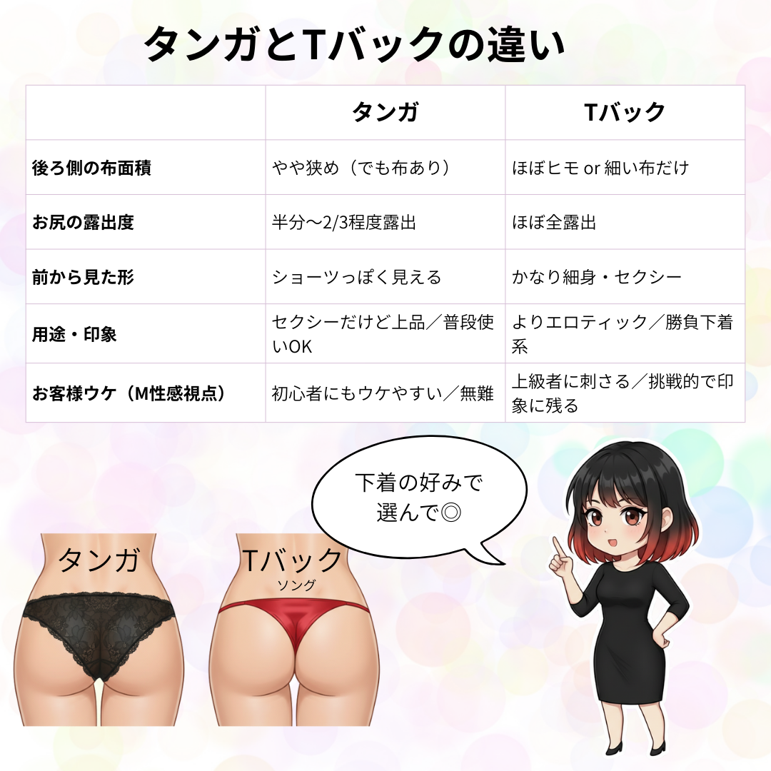 タンガは「色っぽさ+動きやすさ」のバランスが良く、仕事用としても最適。